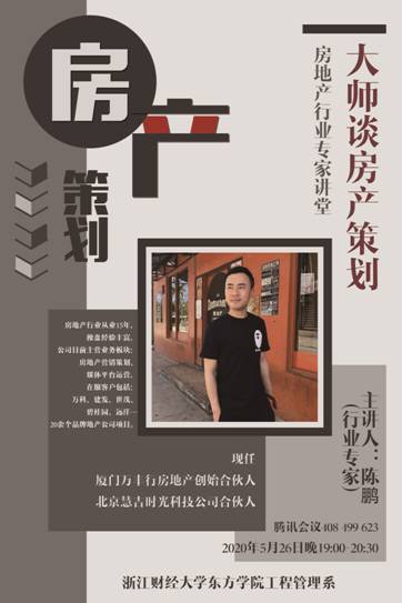 5月26日,工程管理系邀请了房地产策划界的知名行业专家、万丰行房地产总经理陈鹏先生,以“腾讯会议”的形式为工程管理系师生带来了一场题为“基于观音山海景公寓项目的房地产策划”的在线讲座和互动活动。