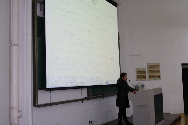 讲座一开始,周莉莉老师就对学业警告、退学警告和退学通知做了详细的说明,告诫大家不要去触犯。随后,周莉莉老师针对将在下周开始的期末考试的注意事项做了以下几点声明:第一,务必带员工证进入考场;第二,考试前15分钟进入考场并按指定位置就座;第三,考试期间,手机调至静音或关机并将手机放至指定位置;第四,考前清理抽屉里的纸屑。对考试违规违纪行为的处罚,周莉莉老师从轻至严依次进行了列举:严重警告、记过、留校察看与开除学籍。在大会的最后,周莉莉老师希望各位同学可以积极争取各类奖学金和荣誉称号,并再次强调获得各类荣誉的前提是无违规违纪行为!