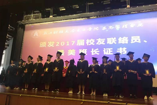 毕业典礼由费松天老师宣读19名省级优秀毕业生、48名校级优秀毕业生名单并颁发了证书;由陈佳骊老师宣读8名优秀毕业论文奖获得者名单并颁发了证书。随后,方昕老师宣读了26位毕业生聘任员工联络人与27位最美班长名单,并为他们分别颁发了证书。