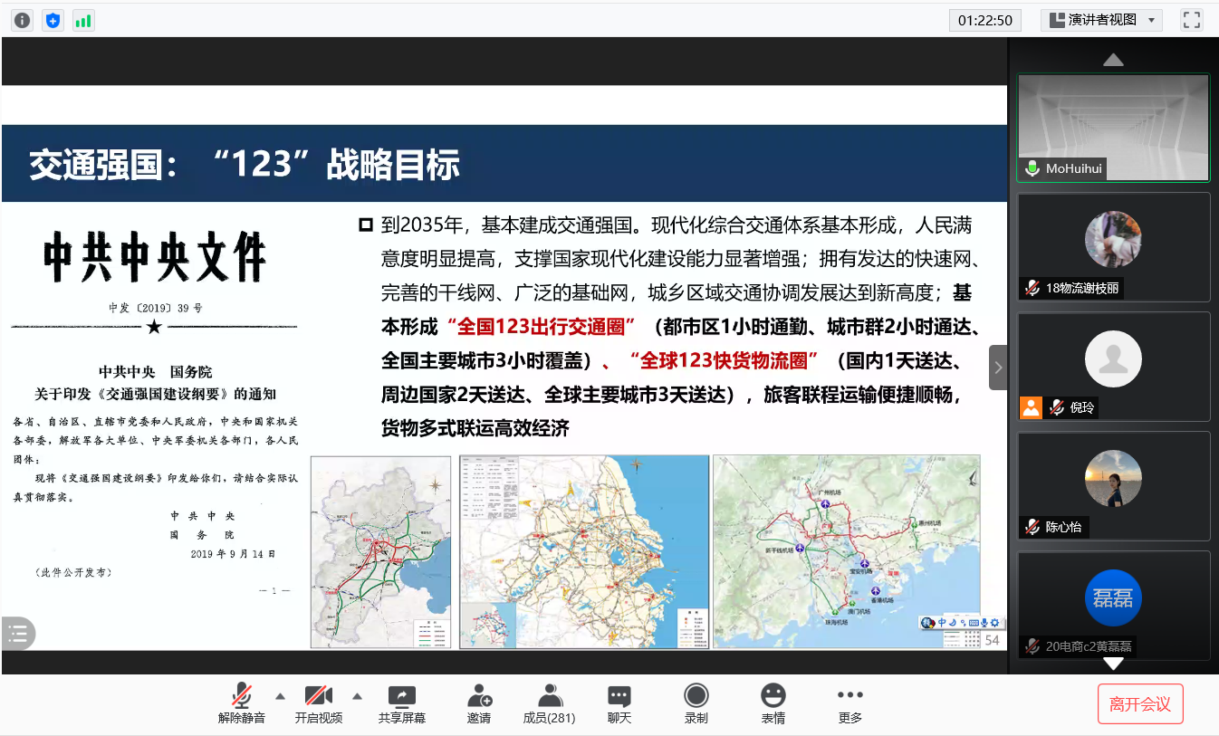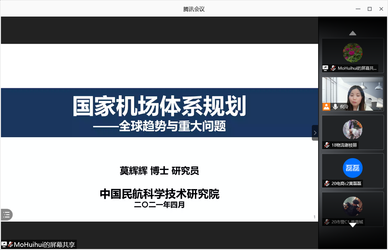 2021年4月21日,应公司邀请,中国民航科学技术研究院研究员莫辉辉博士为公司师生开展了题为“国家机场体系规划——全球趋势与重大问题”的线上专题讲座。本次讲座由公司物流管理系主任、物流与供应链学科带头人倪玲霖教授主持,吸引了全院师生280余人。