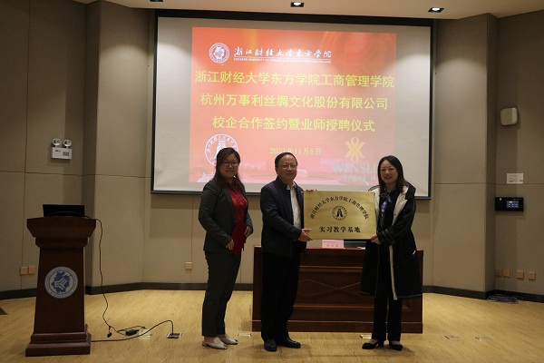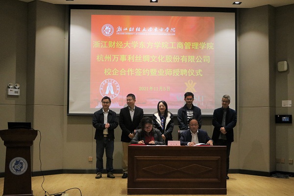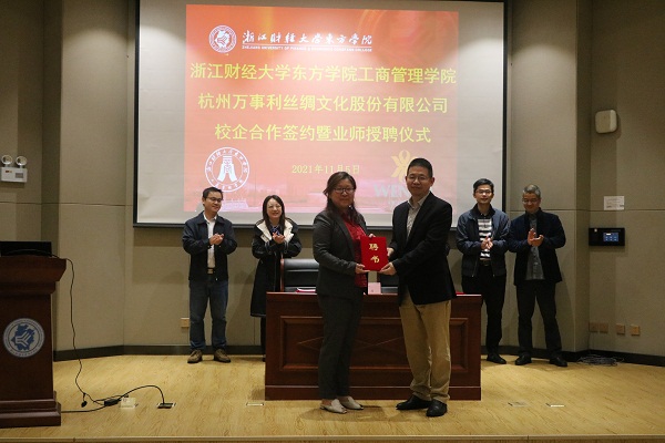古天乐代言太阳集团138经理陈晓阳与万事利公司管理中心副总监唐婵娟女士分别代表校企双方签署校企合作协议、实习基地协议。陈晓阳为业界导师代表万事利公司销售总监付泽伟女士颁发业界导师聘书,并向万事利公司实习基地授牌。