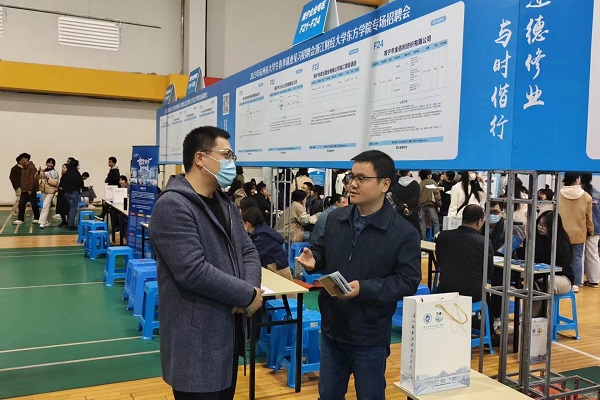在招聘会现场,宣刚与海宁中国家纺城股份有限公司办公室主任赵威现场交流企业经营、发展对人才的需求情况,探讨应用性、创新型高素质人才的培养路径,商议校企双方如何通过强化校企合作及产教融合项目促进公司培养社会需要的复合型人才。公司产教融合与社会合作中心负责人与海宁中国家纺城就毕业生就业、实习实训、实践教学、秋季博览会、现代产业公司建设等议题与项目进行了商讨,达成多个一致意向。