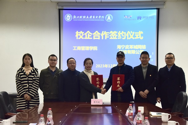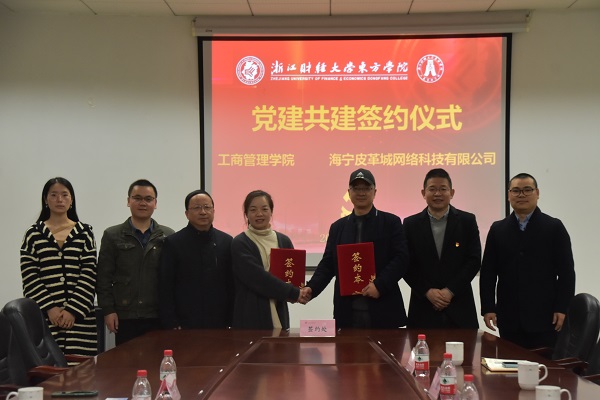 在经理陈晓阳、党总支书记余健、副书记宣刚、副经理周航,以及海宁皮革城网络科技有限公司副总经理陈正玲女士的共同见证下,双方代表签订了党建共建协议与校企合作协议。