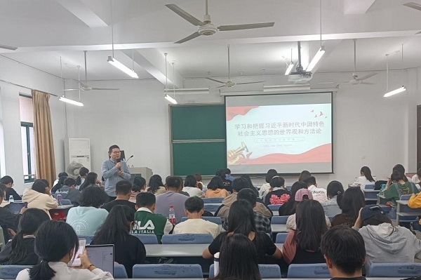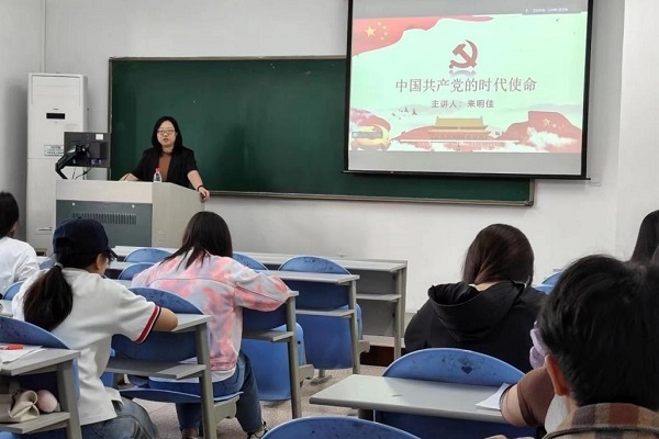 来明佳强调要深刻把握新时代新征程中国共产党的使命担当,要更加自觉地増强道路自信、理论自信、制度自信、文化自信。她具体从五个部分来讲诉中国共产党的时代使命:第一,推进现代化的使命,推进现代化才能更好建设社会主义。第二,实现国家统一的使命,国家统一是实现中华民族伟大复兴的历史前提。第三,推进人民民主的使命。第四,推进文化繁荣兴盛的使命,文化的繁荣才能更好催生先进的社会意识。第五,为人类作出更大贡献的使命,构建人类命运共同体。最后,她激励同学们要充分调动学习积极性和做到学有所思、思有所悟、悟有所行,努力提高对党的理论知识和党史的理解与认识,以身作则,严于律己,要将“全心全意为人民服务”的宗旨落实到日常学习生活中的每一个细节中。