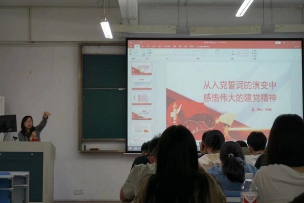 党课初始,朱凌燕通过三个影视片段将同学们带入宣誓这一神圣场面之中。借此情景,她用精神感召青年员工积极加入中国共产党,激励同学们努力向中国共产党靠近。她强调,入党誓词虽然在不同时期的内容和表述不尽相同,但其核心精神始终如一。聚焦不同版本的入党誓词,其始终坚持从“人民”二字出发,忠心为人民服务,一心一意为人民服务。朱凌燕提出,青年学子应学习与感悟中国共产党入党誓词,从其中蕴涵的内心意志、行为规范、价值取向和实践等要求中汲取经验和教训。