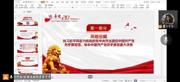 最后,主持人呼吁全体积极分子们感受历史、畅想未来,从党的百年奋斗史中传承红色基因,踔厉奋发、笃行不怠,顽强拼搏、不懈奋斗,为党和人民事业拼搏奉献,在新时代新征程上留下无悔的奋斗足迹,满怀信心地奋进新征程,以优异成绩迎接党的二十大胜利召开。