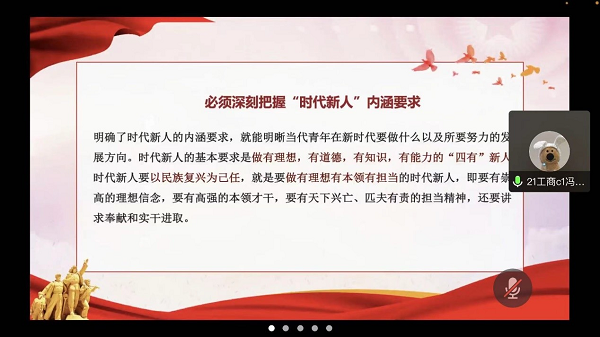 然后,冯同学向大家列举了几位新时代下新青年的代表,每一位代表都用自己的实际行动向大家展示了什么是有理想,有道德,有知识,有能力的“四有”时代新人。紧接着以习近平总书记对青年的寄语为积极分子们指引学习的方向。随后,冯同学将如何成为“时代新人”分为必须深刻把握“时代新人”内涵要求、做好时代新人需要对标对表先进榜样、做好时代新人需要新思维新举措等三个板块具体展开说明。
