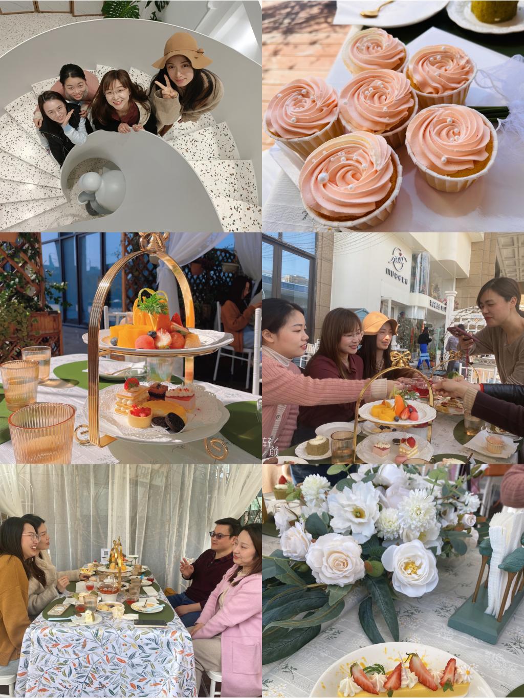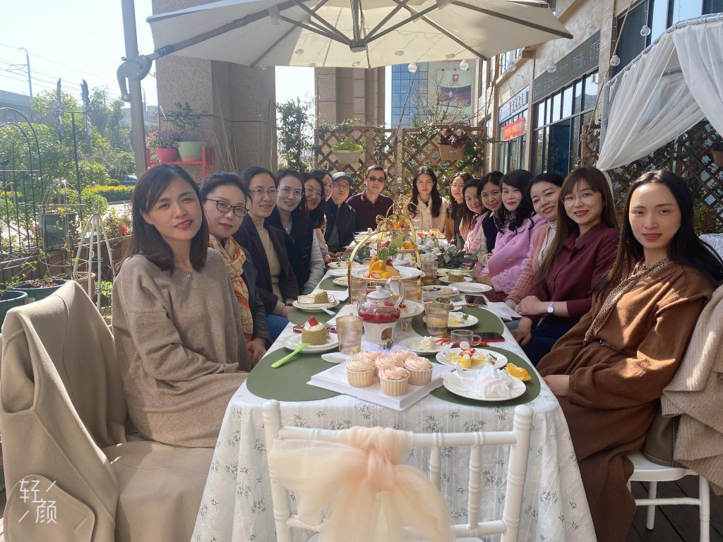 恰逢春光明媚,茶厅环境宜人:室外篱笆小院,日光熠熠,繁花爬墙,自在一方;室内布局玲珑通透,摆件展台斑斓错落,层次设计处处皆景。游赏休憩过后,大家依次入座,一份份精致的茶点如期而至。玫瑰花瓣在透明的玻璃茶壶中轻舞飞扬,蛋糕和水果塔邂逅在英式瓷盘装盛的甜品架,宽慰了众人的口腹和心灵。女教工们或欣赏美景合影留念,或回忆教员工涯趣事、畅谈未来生活设想,品茗尝鲜,畅所欲言,现场氛围和谐欢愉。