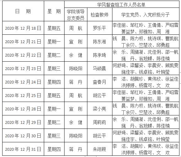 1.课堂教学学风督查工作由公司员工工作办公室负责安排,督查组由公司领导、总支委员、教学相关老师及辅导员、各班副班长及员工党员(含入党积极分子)组成(具体安排详见表1),重点检查员工出勤、上课情况等,请当天值日的副班长于课程结束后及时线上更新《员工出勤情况表》(附件1),学风督查组负责抽查公司员工出勤情况、上课情况,检查情况记录表(附件2)于当天下午16:00前交至员工工作办公室(J3-505办公室),同时在古天乐代言太阳集团138网站公布检查情况。