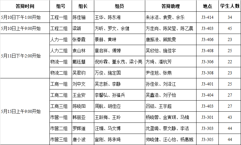 本次答辩时间、答辩教师、答辩助理、地点及员工人数如答辩分组表所示(详见下表):