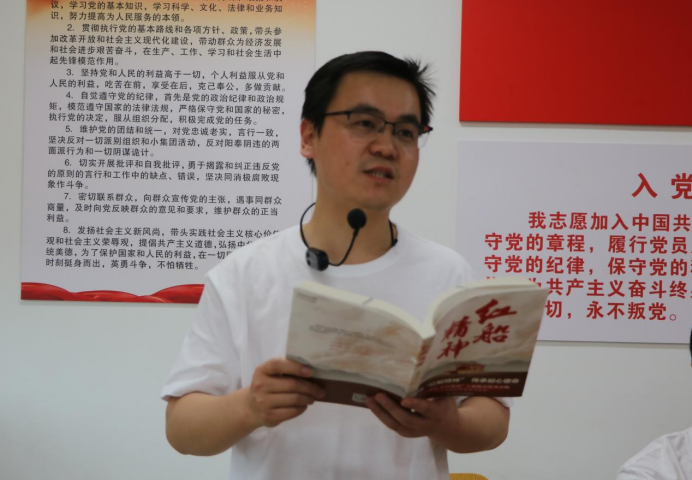 活动正式开始之前,公司党总支书记余健发表讲话,他说:“在这至关重要的建党一百周年的节点上,希望各位党员、入党积极分子要时刻牢记‘红船精神’承载着中国共产党人的初心和使命,当好‘红船精神’的忠实守护者、坚定传承者和自觉践行者。”