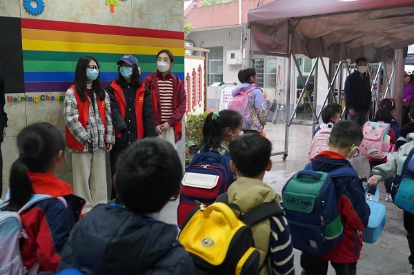 下着小雨,校园门口交通非常拥挤,一群身穿“红马甲”的人便活跃起来,疏导校园门口的车流与人流,为员工们撑伞过马路,志愿者们为员工“护”出了一条平安放学路,成为校园门口一道温暖而亮丽的风景线。